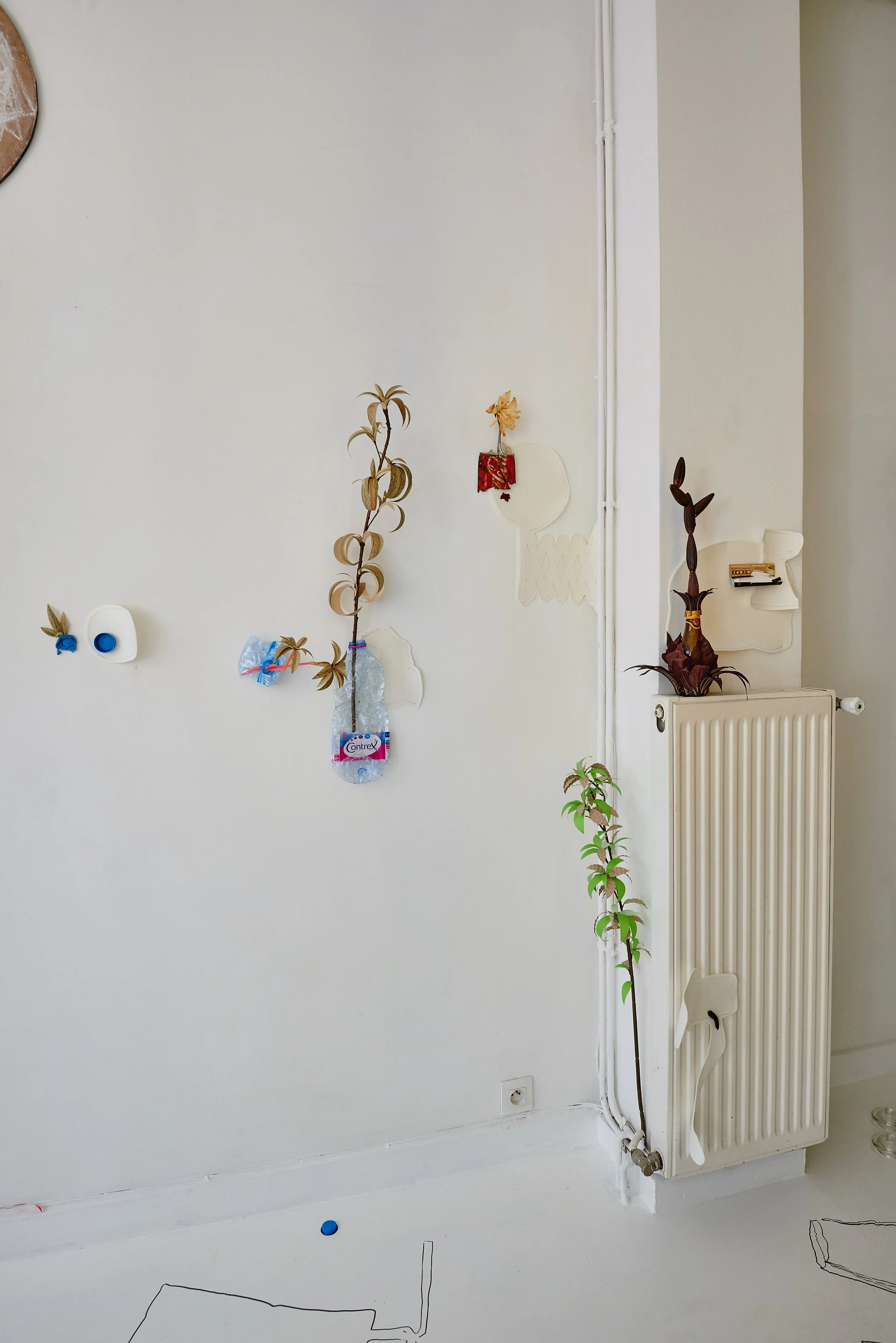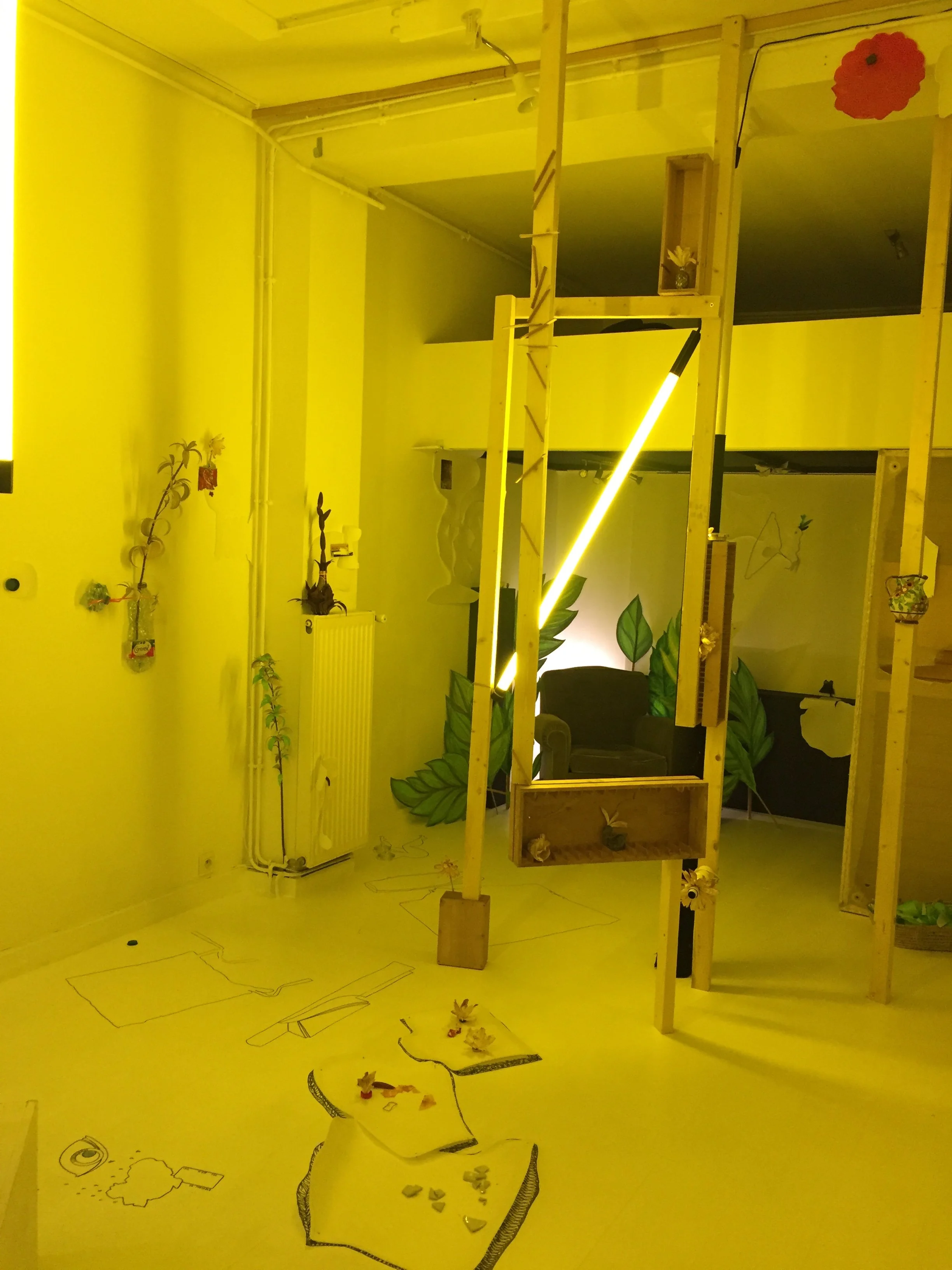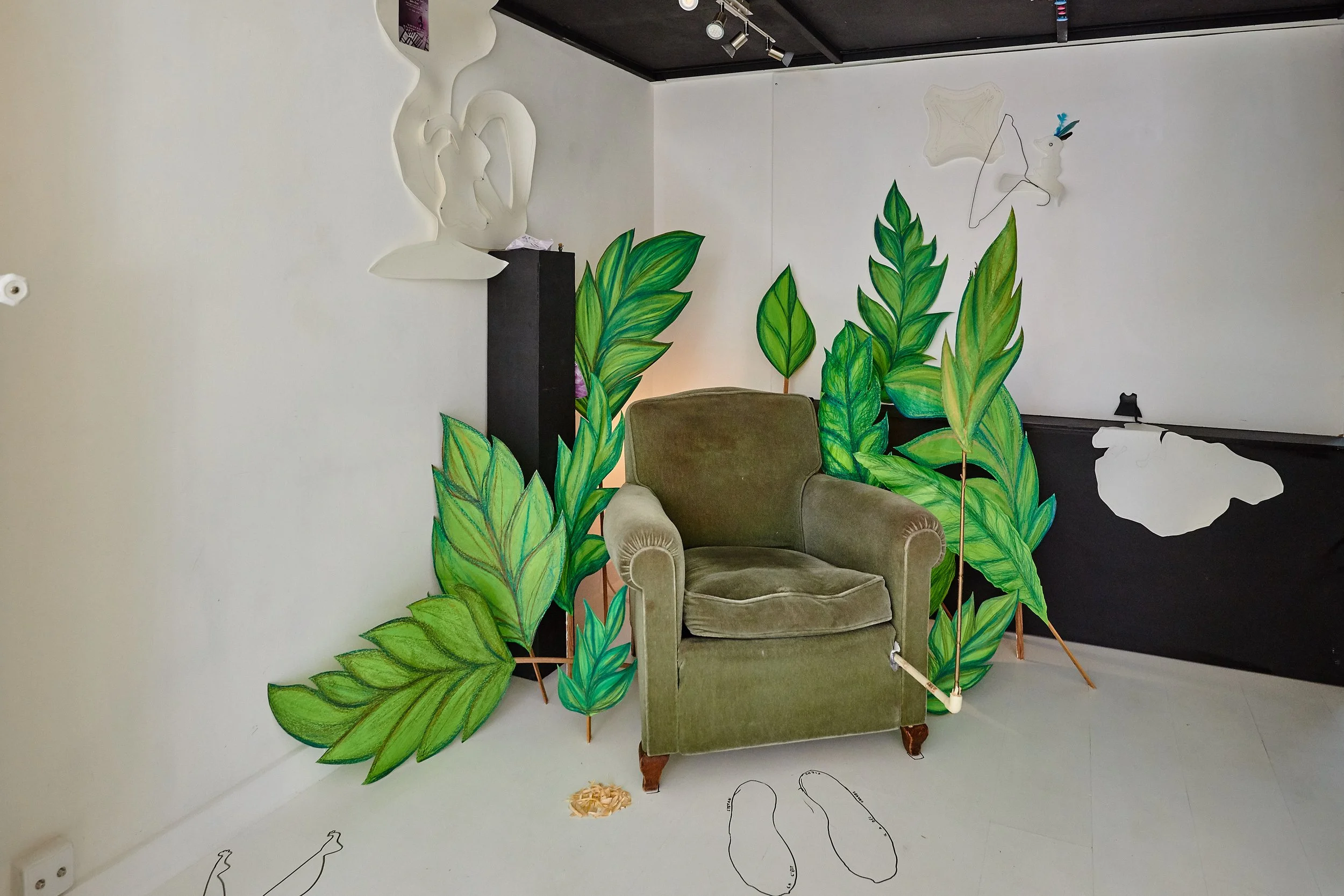 I started to create leaves and flowers, adding a touch of rain to the mineral and minimalistic approach of the artists before me. I wanted to make the gallery bloom, creating a jungle around an armchair we found in the street. The following artists reshaped the space with plastic, colorful lights, writings and frames, creating a new narrative.