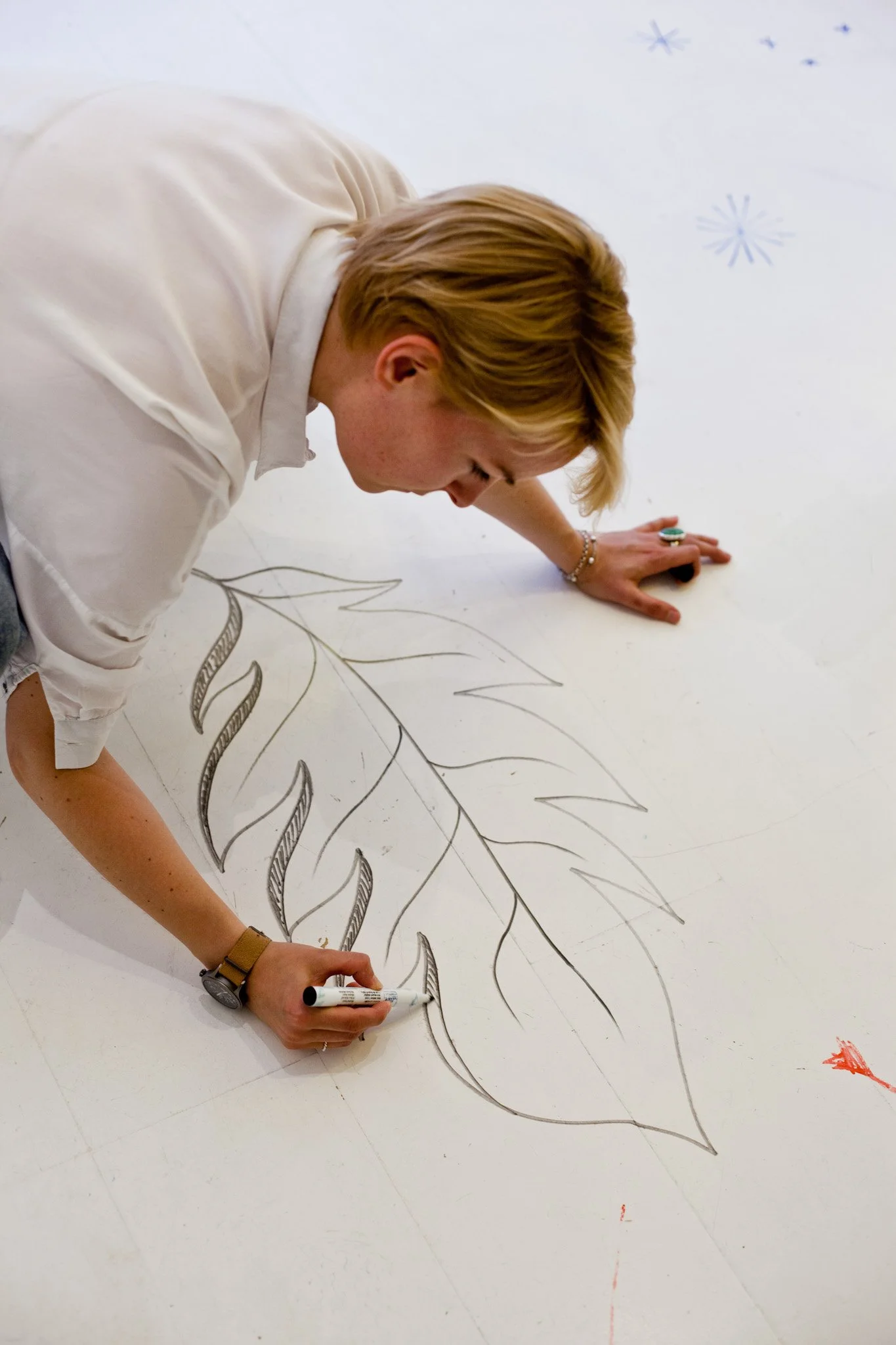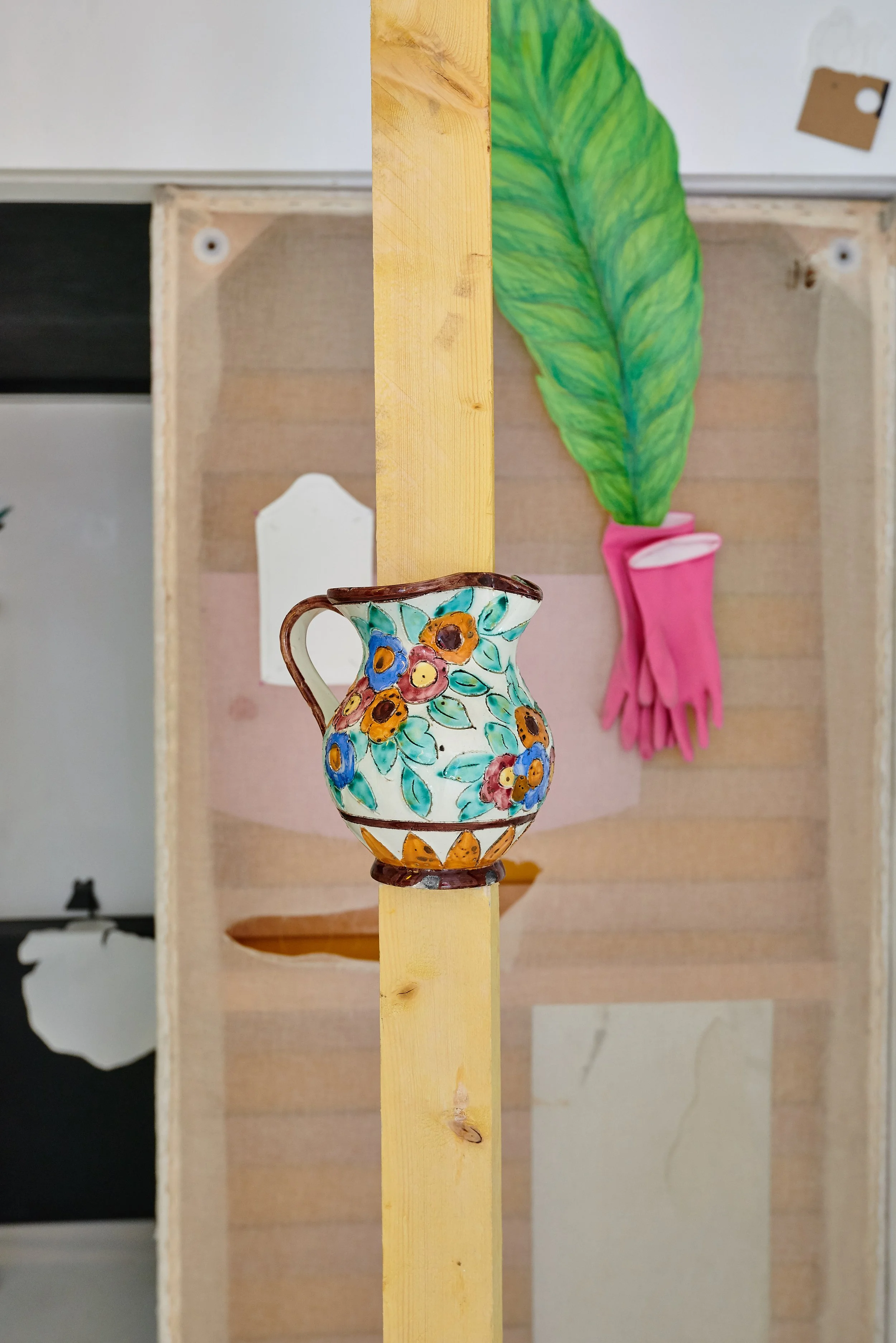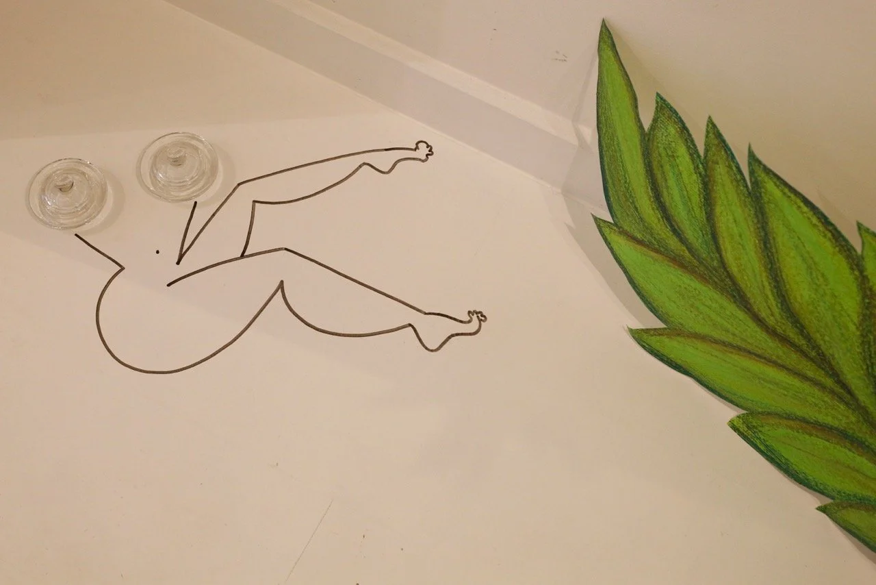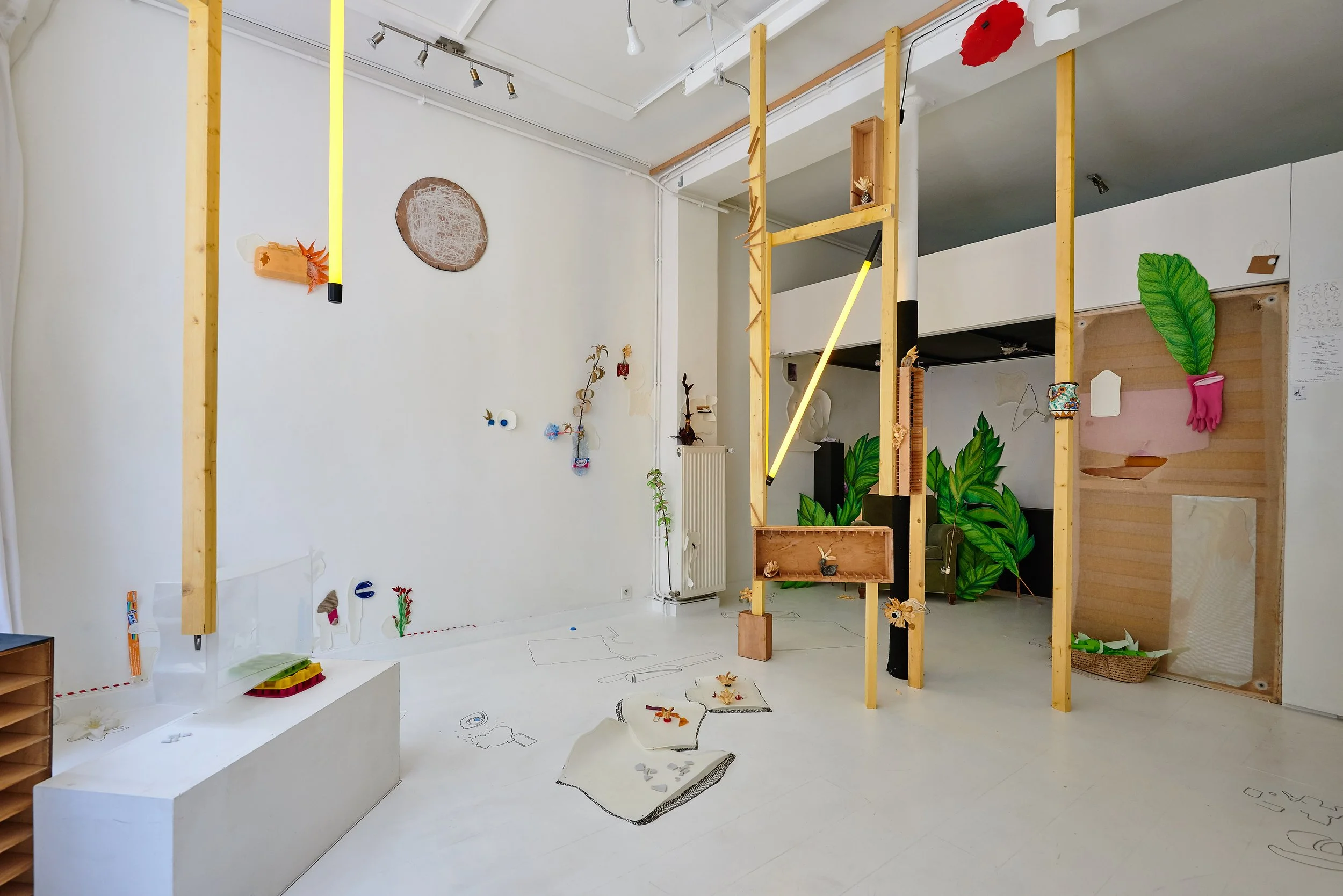 I started to create leaves and flowers, adding a touch of rain to the mineral and minimalistic approach of the artists before me. I wanted to make the gallery bloom, creating a jungle around an armchair we found in the street. The following artists reshaped the space with plastic, colorful lights, writings and frames, creating a new narrative.