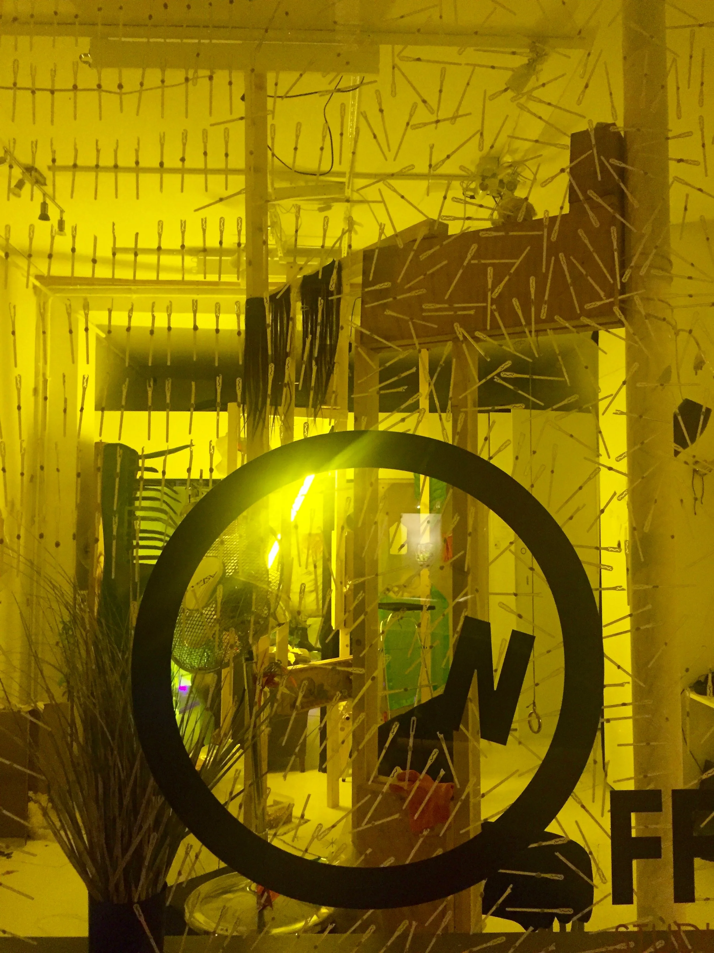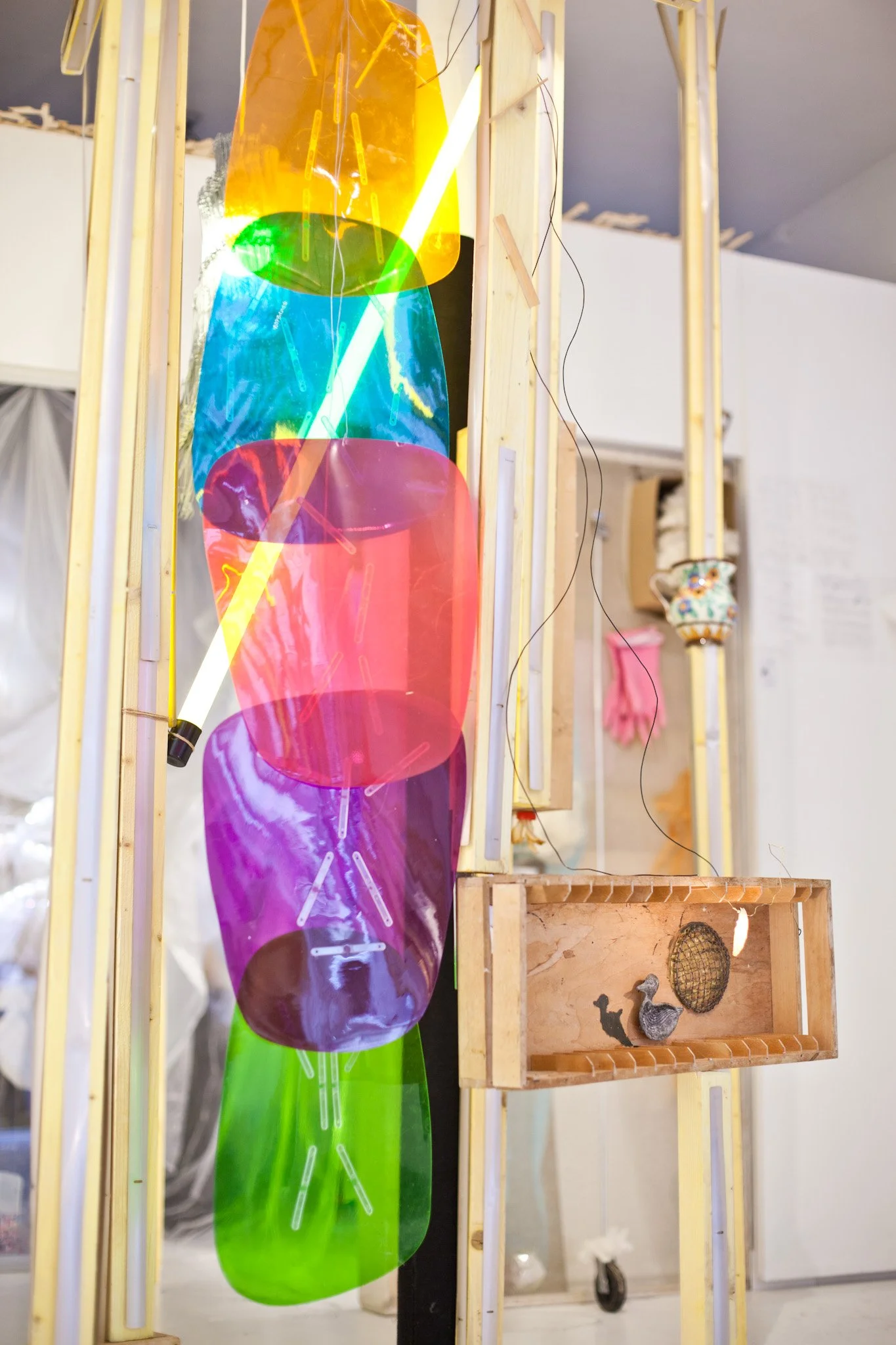 In construction was a site specific installation in Paris, On-Off Studio gallery. Four international artists were invited to spend a week in the gallery space, making an installation using recycled materials. Adapting the surrealists’ Exquisite corpse technique, each artist continued from where the previous artist left.