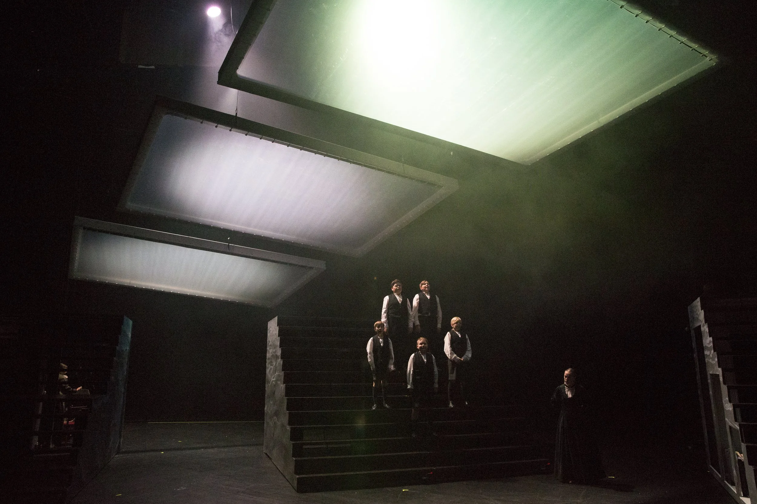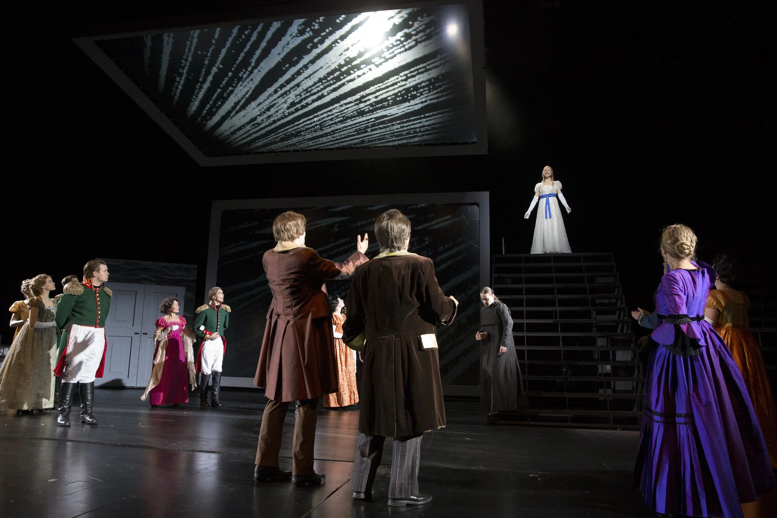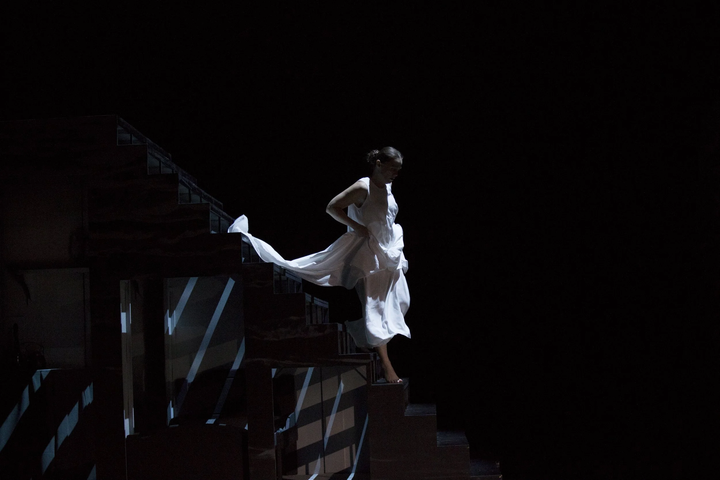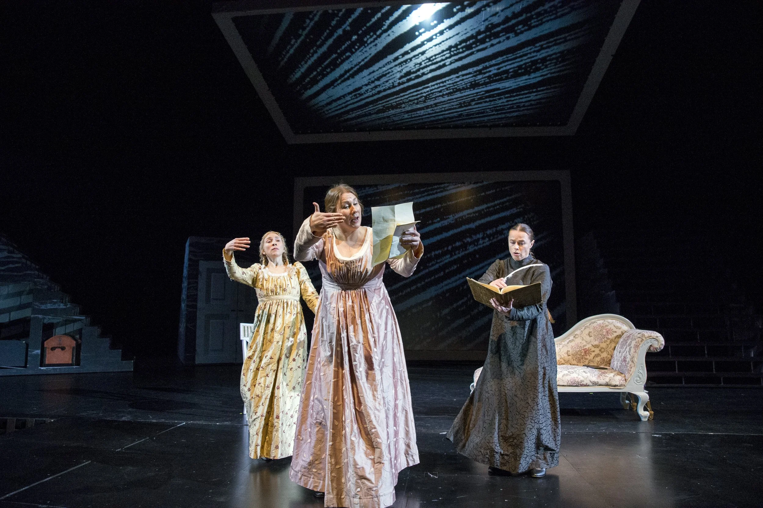 “Sara Wacklinin Oulu palaa” is a historical play that takes place in the city of Oulu at the beginning of the 19th century. It is a story of society’s hierarchies and social structures from a feminist standpoint. The scenography is a modern interpretative twist to the period. It takes over Oulu City Theatre’s big stage with glass ceilings, cage-like frames and enormous staircases - representations of classic power symbols.